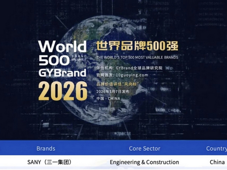 On January 7, GYBrand Global Brand Research Institute released the “2026 World's 500 Most Influential Brands” list. SANY was once again successfully included, ranking 477th and becoming the sole Chinese construction machinery company on the list.
